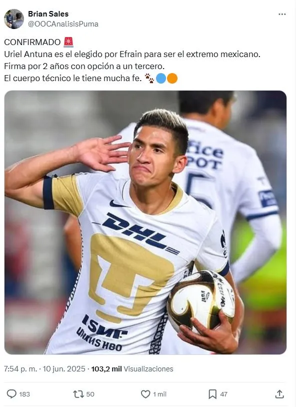 En medio de este contexto, en redes sociales comenzó a crecer el rumor de que Pumas estaba interesado en Uriel Antuna por pedido de Efraín Juárez. El Club Universidad Nacional pretende reforzar su delantera con jerarquía y hasta Jonathan Rodríguez sería una posibilidad. Sin embargo, el caso de El Brujo sería una mera especulación de las redes sociales ya que no ha surgido información fiable al respecto.