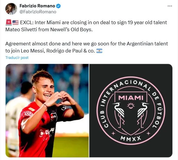 En medio de la incertidumbre alrededor del defensa de 30 años, Fabrizio Romano confirmó que Inter Miami está cerca de cerrar el fichaje de Mateo Silvetti. El delantero argentino de 19 años se viene destacando en Newell’s y es un perfil que le interesa a la institución. Todavía no reveló la cifra en la que sería contratado, pero en Transfermarkt tiene un valor de mercado de 5 millones de euros.