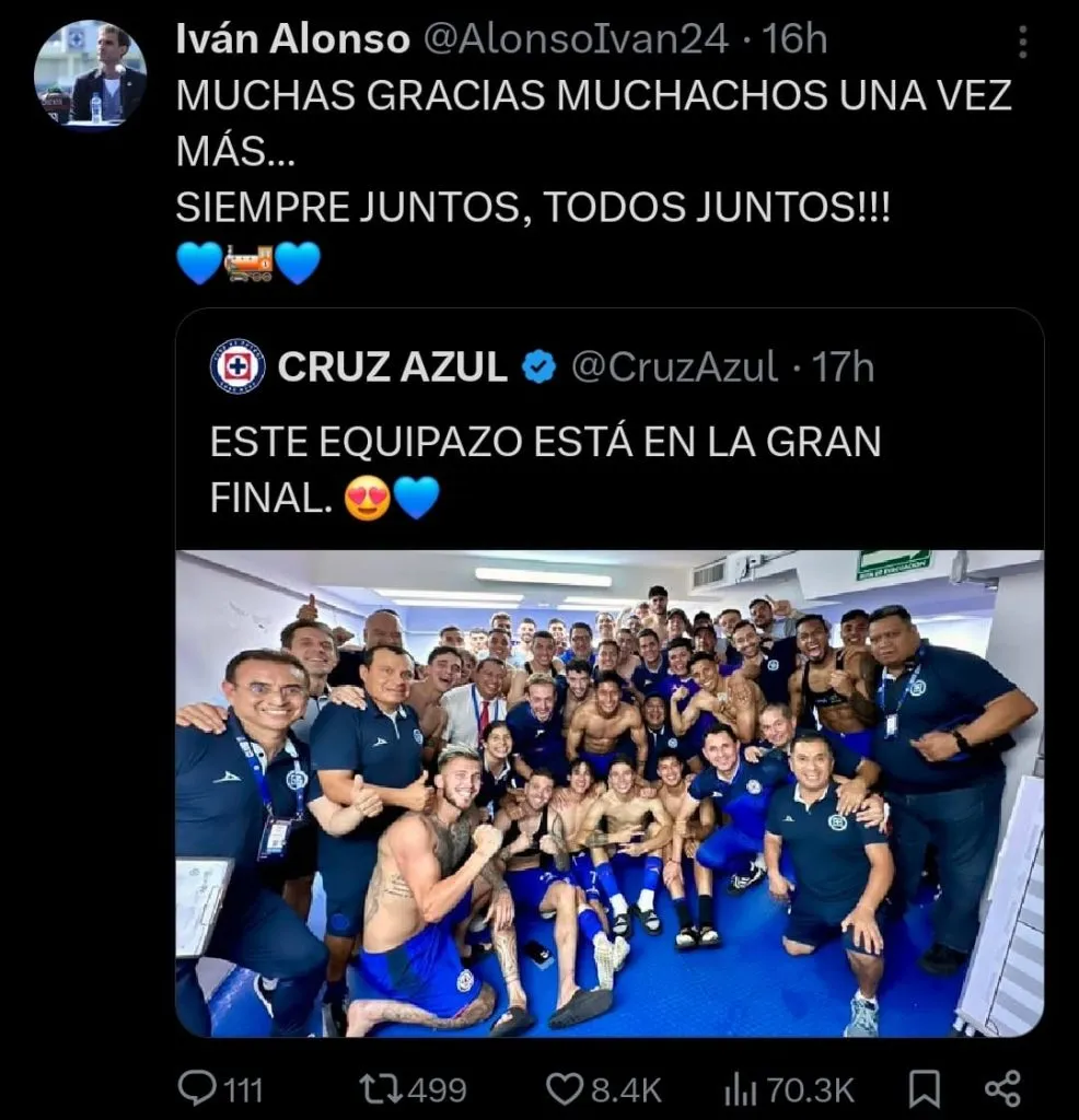 Quién también estuvo activo en sus redes sociales fue el director deportivo, Iván Alonso. A través de su cuenta de X, el uruguayo tomó una publicación de Cruz Azul, y citó: “Muchas gracias muchachos, una vez más. Siempre juntos, todos juntos”