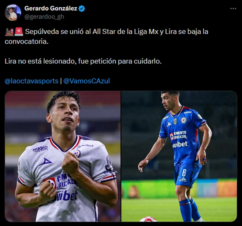 Horas más tarde, el propio periodista dio más información al respecto sobre el tema. Por un lado, finalmente Lira se quedó en México por estricto pedido de Nicolás Larcamón, descartando así todo tipo de lesión o molestia. En tanto, Ángel Sepúlveda viajó a Estados Unidos para unirse al Juego de las Estrellas, ocupando el lugar que dejó Henry Martin (desafectado horas atrás).