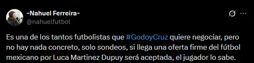 En ese sentido, el periodista Nahuel Ferreira contestó la inquietud sobre uno de sus seguidores. “Es una de los tantos futbolistas que Godoy Cruz quiere negociar, pero no hay nada concreto, solo sondeos, si llega una oferta firme del fútbol mexicano por Luca Martinez Dupuy será aceptada, el jugador lo sabe.