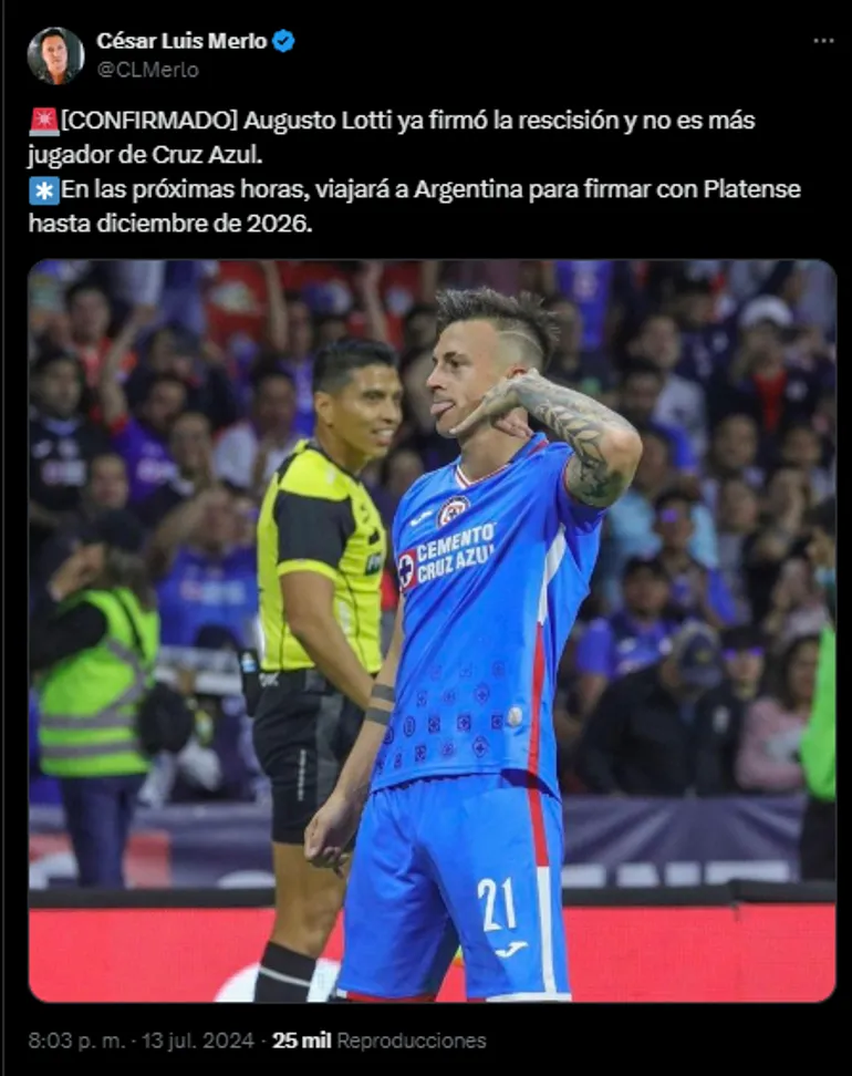 Así lo reveló hace instantes el reportero César Luis Merlo, quien dio detalles al respecto: “CONFIRMADO: Augusto Lotti ya firmó la rescisión y no es más jugador de Cruz Azul. En las próximas horas, viajará a Argentina para firmar con Platense hasta diciembre de 2026″. Sin dudas, un olvidable paso del ariete.