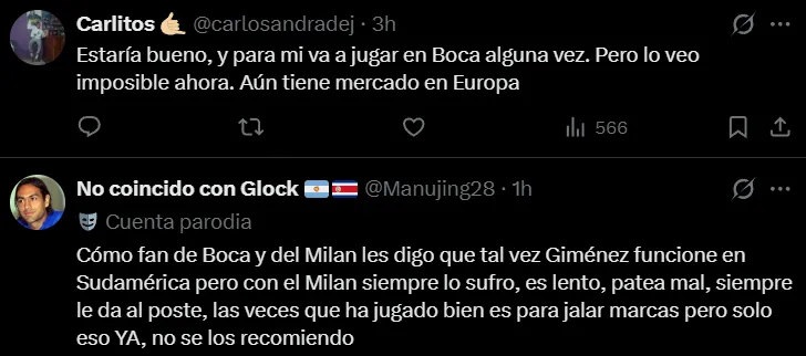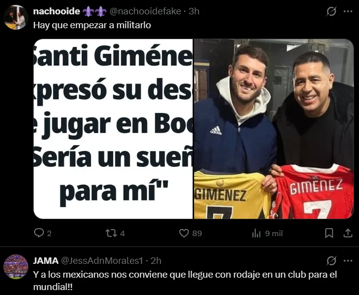 De manera general, muchos usuarios identificados con Boca se sumaron al pedido por Santi Giménez como una buena idea. Aunque, al mismo tiempo, muchos otros dieron cuenta de su valor de mercado y que el Milan posiblemente lo ubique en Inglaterra a cambio de un fuerte monto económico.