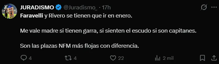 Incluso, algunos usuarios identificados con La Máquina consideraron que los argentinos deberían causar baja en el próximo mercado de fichajes de invierno, liberando así una plaza de No Formado en México.