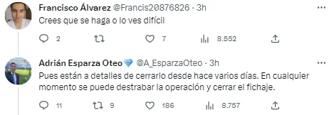 Luego de que un usuario le consultara al reportero si “cree que se haga o lo ve difícil”, llegó la inmediata respuesta: “Pues están a detalles de cerrarlo desde hace varios días. En cualquier momento se puede destrabar la operación y cerrar el fichaje“.