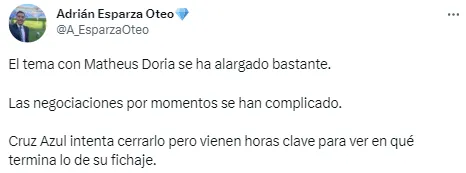 Adrián Esparza Oteo, periodista de TUDN ligado a la institución, apareció en su cuenta de Twitter para brindar un estado de situación sobre la posible llegada del brasileño: “El tema con Matheus Doria se ha alargado bastante. Las negociaciones por momentos se han complicado. Cruz Azul intenta cerrarlo pero vienen horas clave para ver en qué termina lo de su fichaje“.