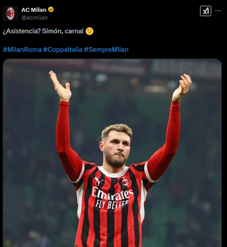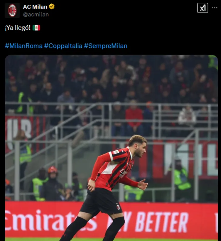 “¡Ya llegó!” fueron las escuetas pero contundentes palabras del Milan para el ex cementero, en donde se capturó el momento justo mientras ingresaba al campo de juego. Pero eso no fue todo, ya que una vez concluido el partido también pusieron para el deleite de los mexicanos “¿Asistencia? Simón, carnal“.
