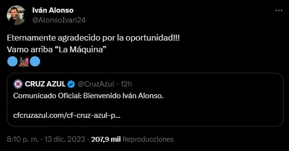 “Eternamente agradecido por la oportunidad, vamo arriba La Máquina” y “Todos juntos podemos”, las frases que escogió Iván Alonso para su primera aparición pública luego del comienzo de su nuevo y crucial rol en Cruz Azul.