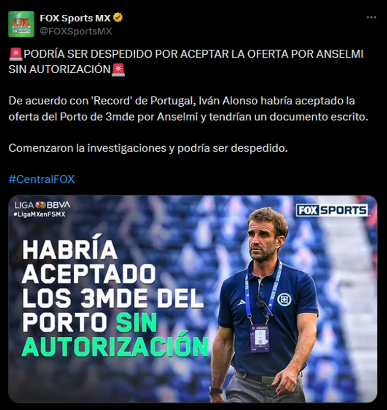 El caos reina en Cruz Azul desde hace días, luego de que se confirmara la repentina salida de Martín Anselmi del club. Pocos entendían la drástica decisión del estratega argentino, pero conforme fueron pasando las horas pareciera que todo va tomando más sentido: Allí es donde aparece la figura de Iván Alonso.