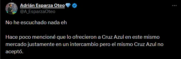 En ese mismo mensaje, el comunicador de TUDN e integrante del Podcast de La Máquina agregó: “Hace poco mencioné que lo ofrecieron a Cruz Azul en este mismo mercado justamente en un intercambio, pero el mismo Cruz Azul no aceptó”. Sin dudas, hubiese sido una operación de mucho ruido.