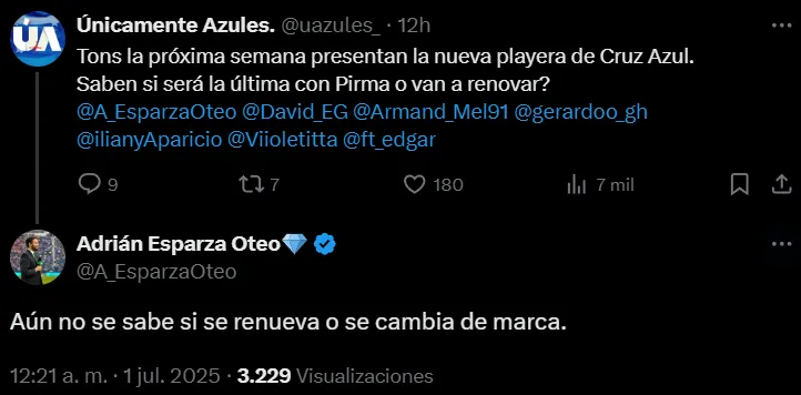 A pocos días de la presentación del nuevo uniforme cementero para la próxima temporada, un usuario famoso consultó sobre si finalmente Cruz Azul cambiará de patrocinador. El periodista de TUDN respondió y aclaró que no está definido si se renovará con pirma o se cambiará de marca.