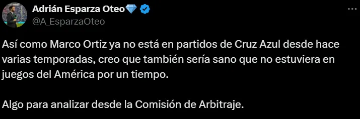 “Así como Marco Ortiz ya no está en partidos de Cruz Azul desde hace varias temporadas, creo que también sería sano que no estuviera en juegos del América por un tiempo. Algo para analizar desde la Comisión de Arbitraje”, escribió en su cuenta de X.