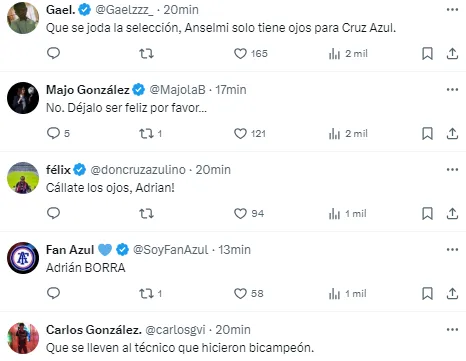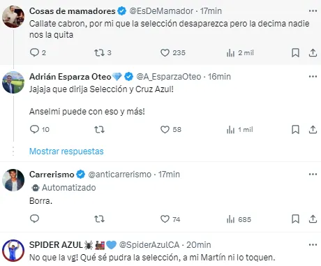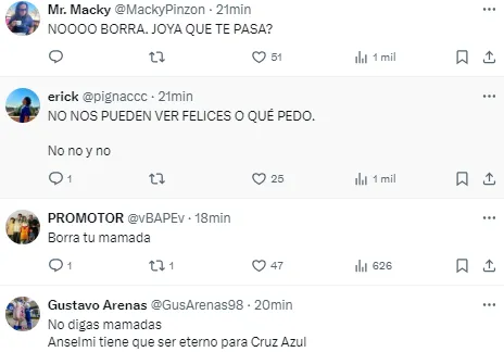 La publicación tuvo una altísima repercusión en la red social, pues los aficionados de Cruz Azul se volcaron masivamente a responderle a Esparza que elimine su posteo y no le de ideas a la FEMEXFUT. “Borra”, fue el comentario que más se repitió.