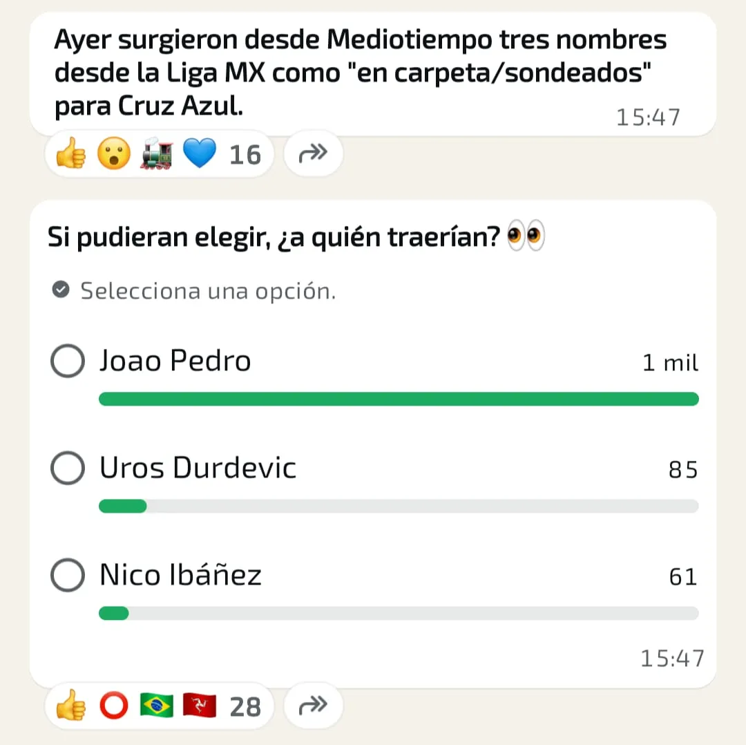 Para conocer la opinión de los seguidores celestes, Vamos Azul lanzó una encuesta sobre cuál de los tres delanteros debería reforzar a Cruz Azul. Lanzada mediante los canales de WhatsApp, se convirtió en un verdadero termómetro de la pasión y las preferencias de la hinchada.