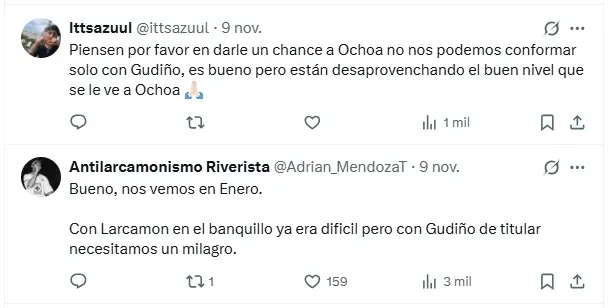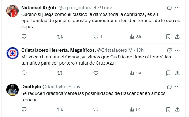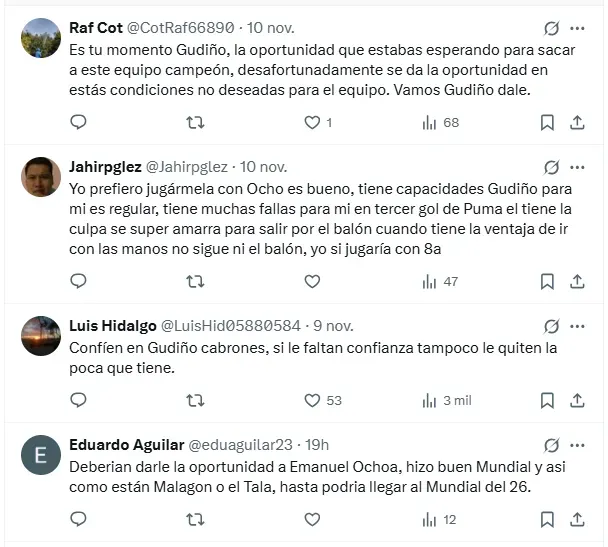 “Pues si ya andamos en esas que sea Emmanuel Ochoa, Gudiño nunca ha dado ese salto que tanto se le ha pedido” o “Yo prefiero jugármela con Ochoa, es bueno, tiene capacidades Gudiño para mi es regular, tiene muchas fallas para mi. En tercer gol de Pumas él tiene la culpa, se súper amarra para salir por el balón cuando tiene la ventaja de ir con las manos no sigue ni el balón, yo si jugaría con Ochoa”, remarcaron algunos aficionados en favor del juvenil.