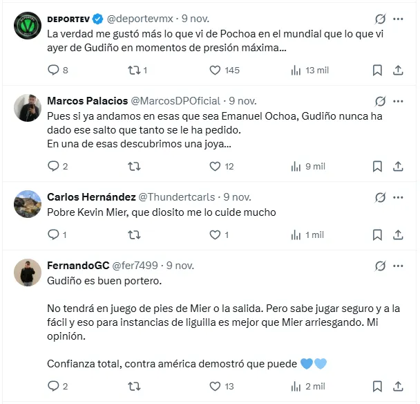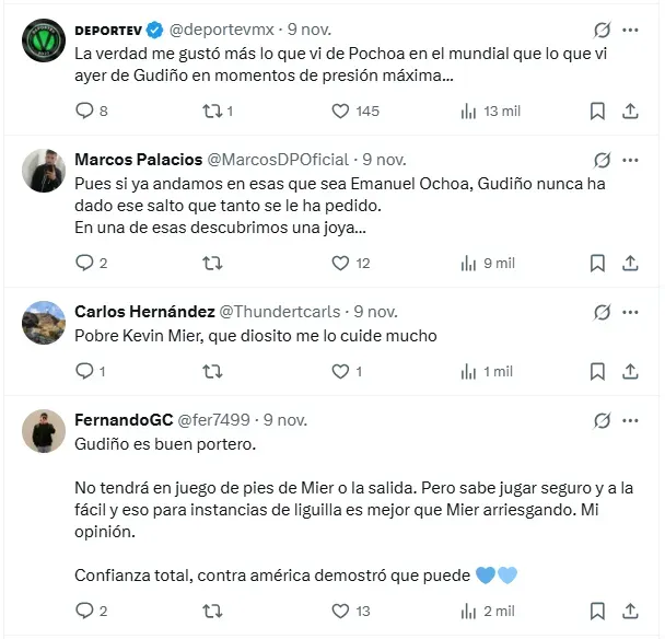 Por otro lado, quienes respaldaron a Gudiño destacan su seguridad y su capacidad para mantener la portería protegida en instancias decisivas. Uno de ellos señaló: “Gudiño es buen portero. No tendrá en juego de pies de Mier o la salida. Pero sabe jugar seguro y a la fácil y eso para instancias de liguilla es mejor que Mier arriesgando. Confianza total, contra América demostró que puede”, enfatizando la importancia de su experiencia.