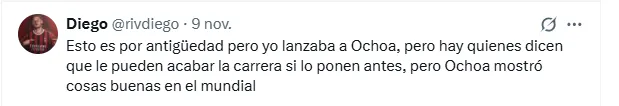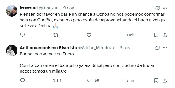 La discusión también se mezcló con críticas y recomendaciones sobre oportunidades futuras, volcándose a favor de la promesa de fuerzas básicas: “Piensen por favor en darle un chance a Ochoa, no nos podemos conformar solo con Gudiño, es bueno pero están desaprovechando el buen nivel que se le ve a Ochoa”, escribió un seguidor.