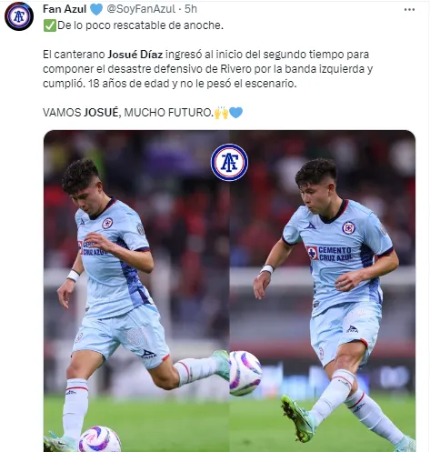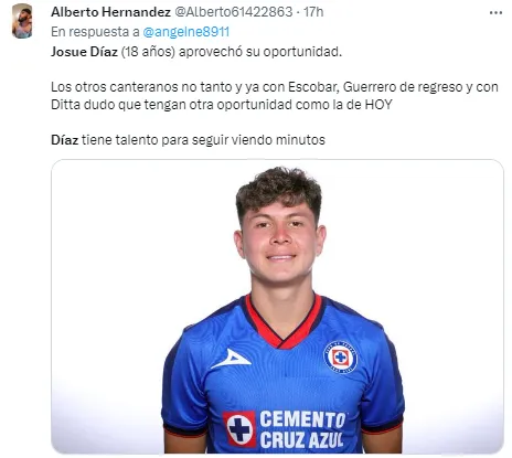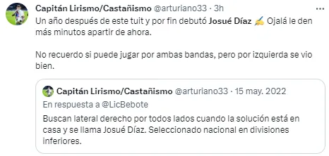 “Un año después de este tuit y por fin debutó Josué Díaz. Ojalá le den más minutos a partir de ahora […] por la izquierda se vio bien”