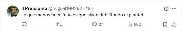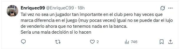 Sin embargo, la mayoría coincidió en que venderlo ahora sería una mala decisión: “Tal vez no sea un jugador tan importante en el club, pero hay veces que marca diferencia en el juego, igual no se puede dar el lujo de venderlo ahora que no tenemos nada en la banca. Sería una mala decisión si lo hacen”.