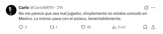 Otros, apuntaron a la falta de comodidad que el delantero experimentó en México: “No me parece que sea mal jugador, simplemente no estaba cómodo en México. Lo mismo pasa con el polaco, lamentablemente”. Mientras que algunos seguidores no dudaron en desear que el PAOK concretara la opción de compra: “Ufff, ojalá meta más para que se haga válida la opción de compra y no vuelva ese muerto” o “Ojalá lo compre, vamos PAOK, es buenísimo el Yukamakis, ya tiene dos goles”.