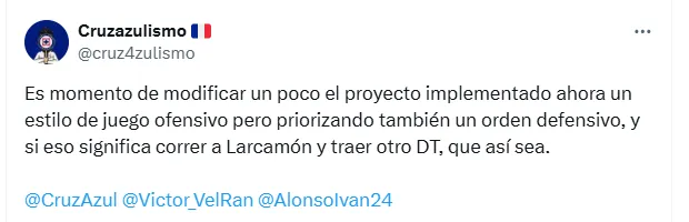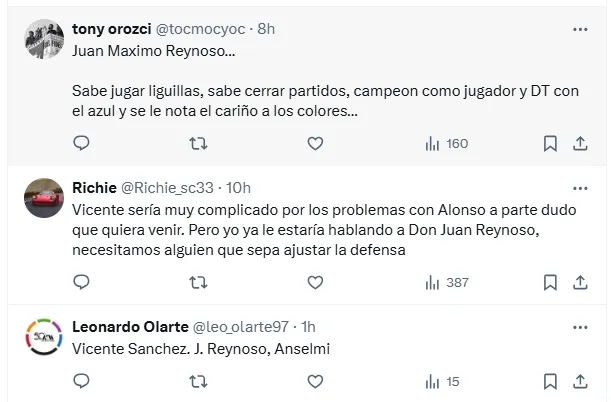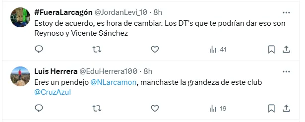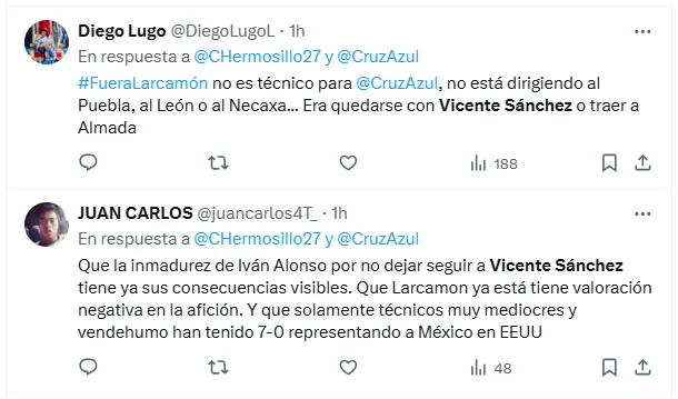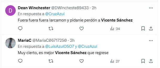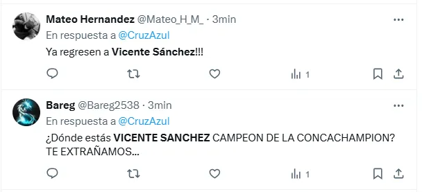 “¿Dónde estás, Vicente Sánchez, campeón de Concachampions? Te extrañamos”, “Oye Cruz Azul, nos corriste a Vicente Sánchez por ganar la Concachampions y bajo la misma vara corre al DT de equipos chicos Larcamón. ¡EL PAPELÓN DE AYER NO PUEDE PASAR POR ALTO!” y “Era quedarse con Vicente o traer a Almada”, fueron algunos de los comentarios más repetidos en X.