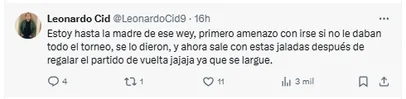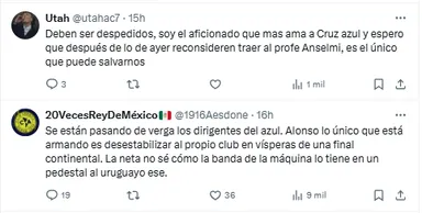 La reacción fue instantánea y furiosa. Muchos consideraron inaceptable que, en la antesala de una final, se generen este tipo de tensiones dentro del club. “Deben ser despedidos”, escribió un seguidor celeste. “Soy el aficionado que más ama a Cruz Azul y espero que reconsideren traer al profe Anselmi, es el único que puede salvarnos” y “Si pensamos que Anselmi se había comportado como todo un mercenario, esto ya es una actitud de sicario“, mencionaron otros.