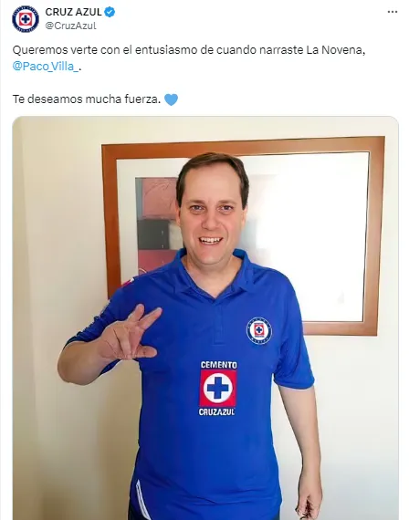 Desde que Paco Villa confirmó su estado de salud, Cruz Azul no dudó en unirse a las muestras de apoyo, por lo que le dedicó una emotiva publicación a través de su cuenta de Twitter, en la que recordó su narración en la conquista de la novena, así como una postal en la que luce con la camiseta celeste bien puesta.