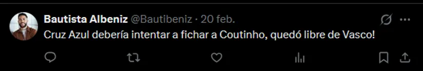 El sueño de verlo en la Noria es alimentado por la necesidad de un generador de juego tras las recientes bajas, en donde el usuario Bautista Albeniz también se animó a soñar dejando un recado para la directiva: “Cruz Azul debería intentar fichar a Coutinho, quedó libre de Vasco!“, advirtió.