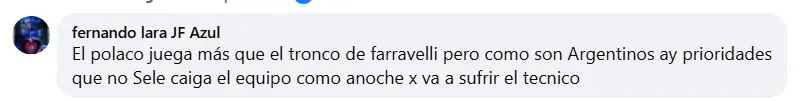 Algunos, más enojados, atribuyeron la falta de protagonismo del europeo a favoritismos: “El polaco juega más que el tronco de Faravelli, pero como son argentinos, hay prioridades”. La sensación general es que el talento del jugador está siendo desaprovechado, mientras el equipo experimenta con cambios que no terminan de convencer.