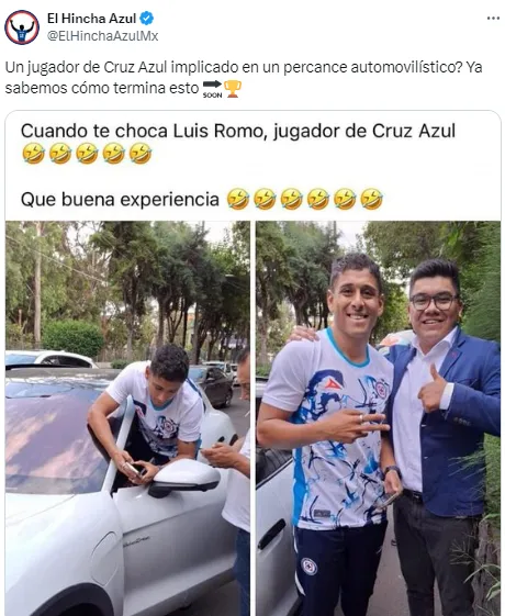 Se trata de una curiosidad que la afición detectó en las últimas horas. Esto, luego de que trascendiera que Luis Romo habría tenido un pequeño percance automovilístico, en el que habría chocado con su auto justo al de un aficionado de La Máquina.
