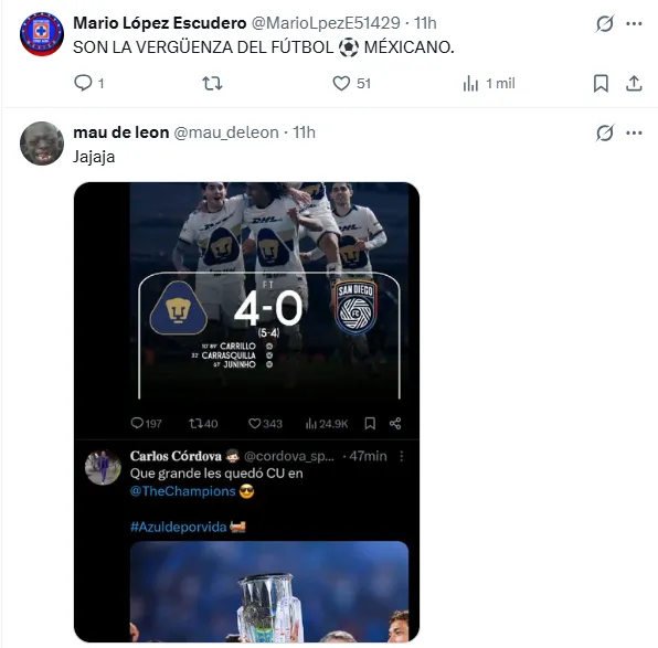 Con la herida aún fresca por la salida de CU, la afición de Cruz Azul convirtió la eliminación universitaria en tendencia. Las redes sociales se llenaron de mensajes irónicos, sarcásticos y directos. “SON LA VERGÜENZA DEL FÚTBOL MEXICANO”, escribió un usuario, en un mensaje que rápidamente se viralizó entre la nación cementera.