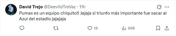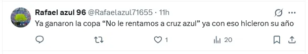 Otro aficionado apuntó con ironía directa al conflicto por el estadio: “Ya ganaron la copa ‘No le rentamos a Cruz Azul’, ya con eso hicieron su año”. La comparación con el peso histórico del estadio tampoco faltó. “Pumas es un equipo chiquito!! Jajaja su triunfo más importante fue sacar al Azul del estadio“, posteó otro.