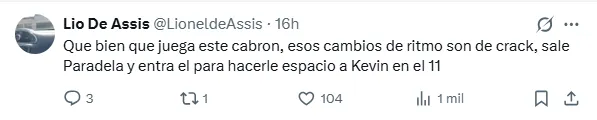 Su ingreso cambió la dinámica del mediocampo, generando espacios para sus compañeros y aportando frescura al juego. La afición rápidamente reconoció su aporte: “Que bien que juega este cabrón, esos cambios de ritmo son de crack, sale Paradela y entra él para hacerle espacio a Kevin en el 11” y “Entró y de inmediato se notó su presencia, que lectura de juego tiene, que visión. Crack total!”.