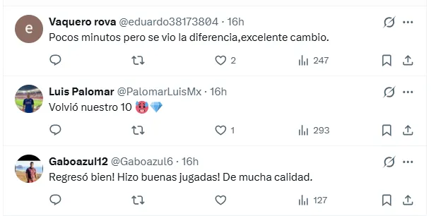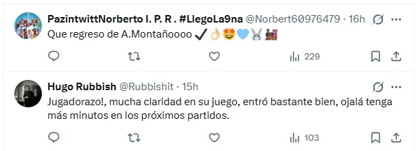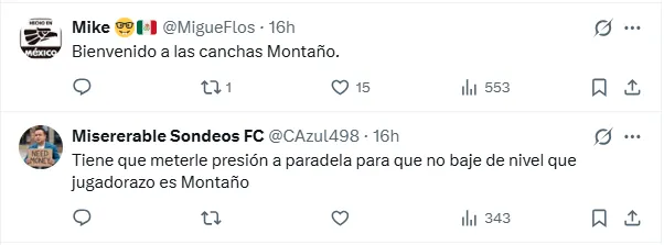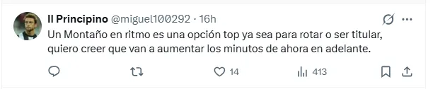 Otros seguidores resaltaron la posibilidad de que Montaño gane más protagonismo en el equipo: “Tiene que meterle presión a Paradela para que no baje de nivel, qué jugadorazo es Montaño” y “Un Montaño en ritmo es una opción top ya sea para rotar o ser titular, quiero creer que van a aumentar los minutos de ahora en adelante”.