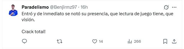 Incluso hubo quienes destacaron la claridad de su juego y su capacidad de adaptarse rápidamente: “Jugadorazo!, mucha claridad en su juego, entró bastante bien, ojalá tenga más minutos en los próximos partidos”.