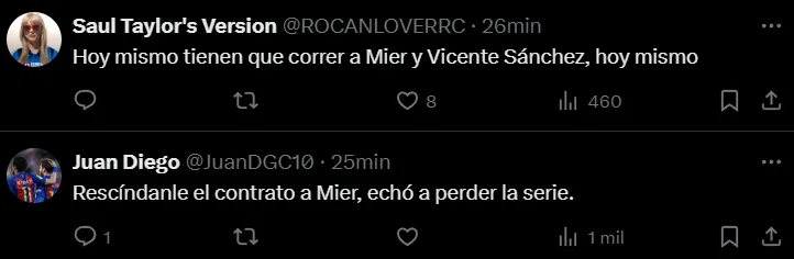 A través de la red social X, aficionados de Cruz Azul apuntaron contra Kevin Mier, a quien señalaron como uno de los responsables de la derrota. Algunos insultos desmedidos, pedidos de “adiós”, acusaciones como “echó a perder la serie” o “de nada sirve si tiene ese tipo de errores en partidos importantes”, no se hicieron esperar sobre el guardameta.