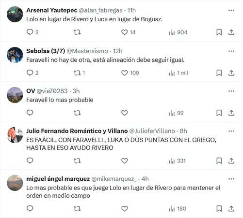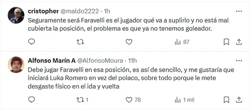 Faravelli no hay de otra, esta alineación debe seguir igual“, “Es fácil, con Faravelli, Luka o dos puntas con el griego, hasta en eso ayudó Rivero” y “Seguramente será Faravelli, es el jugador que va a suplirlo y no está mal cubierta la posición“, fueron algunas reacciones.