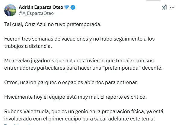 “Fueron tres semanas de vacaciones y no hubo seguimiento a los trabajos a distancia. Me revelan jugadores que algunos tuvieron que trabajar con sus entrenadores particulares para hacer una “pretemporada” decente.”, explicó el periodista de TUDN.