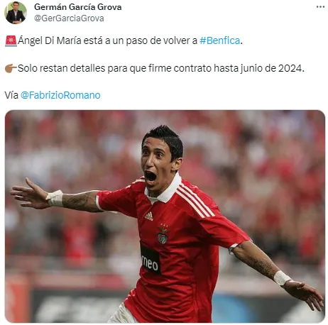 De acuerdo a información del periodista ligado al mercado de fichajes, Fabrizio Romano, Ángel Di María se convertirá en nuevo refuerzo del Benfica de Portugal, equipo para el que jugó entre los años 2007 y 2010.