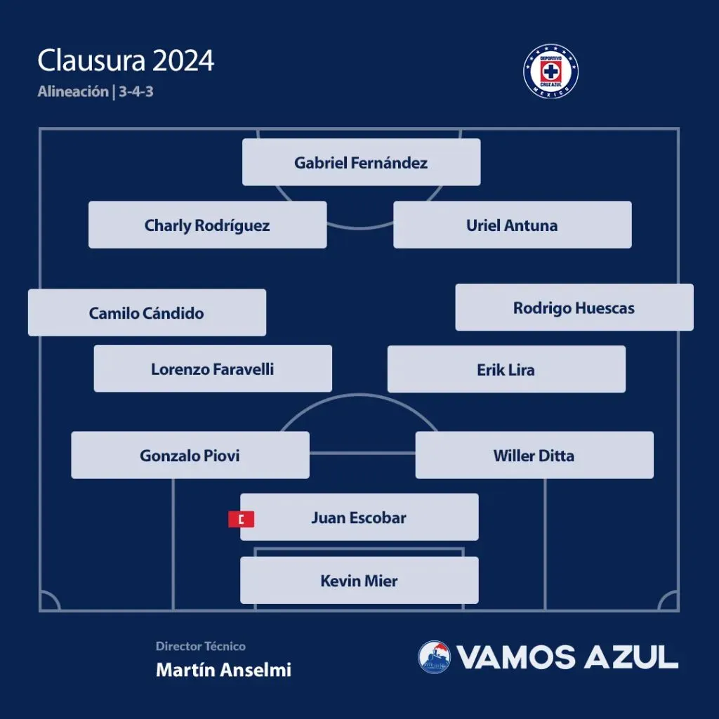 En la propuesta (bajo un esquema 3-4-3) destacamos la presencia de los cinco refuerzos (todos ellos extranjeros) que han llegado a Cruz Azul: el portero colombiano Kevin Mier, el defensa argentino Gonzalo Piovi, el lateral uruguayo Camilo Cándido, el volante Lorenzo Faravelli y el delantero charrúa Gabriel Fernández.