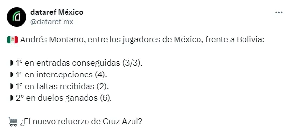De acuerdo con información de Dataref México, Andrés Montaño se convirtió en el jugador con más entradas conseguidas, así como el número uno en intercepciones, con cuatro, y duelos ganados con seis. Además, es el jugador que más faltas recibió con dos.