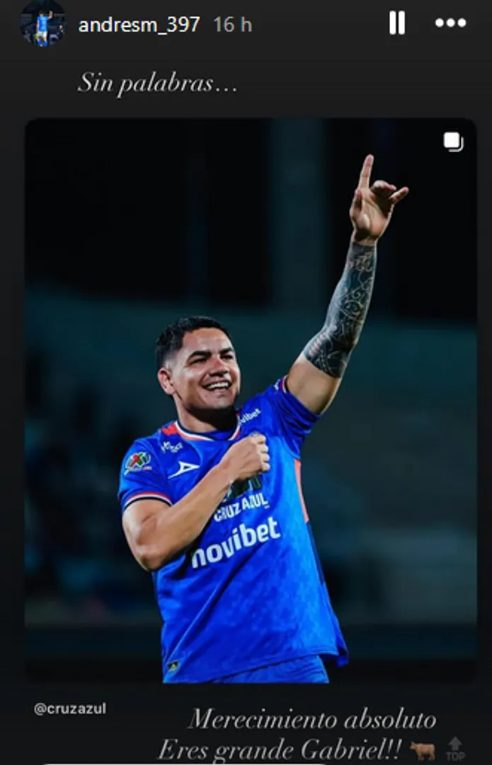 Por otro lado, quien reapareció público fue nada menos que Andrés Montaño, el dueño del dorsal 10 en Cruz Azul y quien se expresó en su cuenta de X, “Sin palabras…Merecimiento absoluto, ¡Eres grandes Gabriel!“, expresó el ex futbolista de Mazatlán en una de sus historias de Instagram.