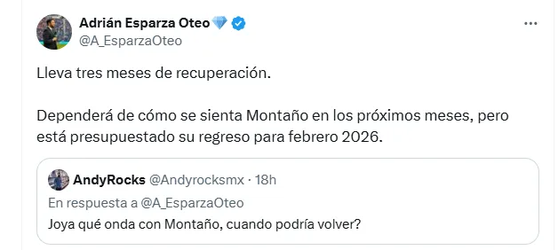 Eso fue lo que respondió puntualmente el reportero Adrián Esparza a un aficionado a través de la red social X. Según el hombre de TUDN, “lleva tres meses de recuperación” y su reaparición dependerá de cómo se sienta en los próximos meses, aunque señaló que “está presupuestado su regreso para febrero de 2026”, es decir, cuando ya esté en marcha el Clausura 2026.