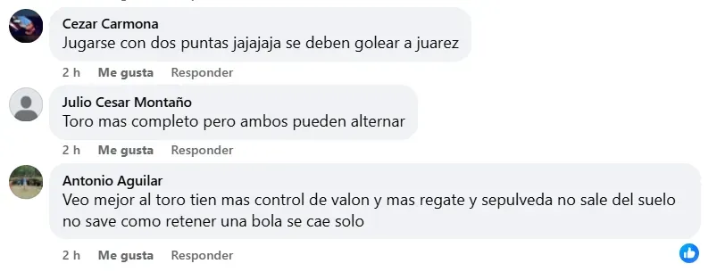 En las redes sociales de Vamos Azul y en general se vertieron distintas opiniones en torno al tema y los comentarios se decantaron por la alternativa del uruguayo, atendiendo principalmente a la recuperación del Cuate. “Toro más completo pero ambos pueden alternar”, “Veo mejor al Toro tiene más control de balón y más regate, y Sepúlveda no sale del suelo no sabe como retener una bola, se cae solo” y “creo que debe iniciar el Toro y en el segundo tiempo darle minutos a Sepu” fueron algunas reacciones.