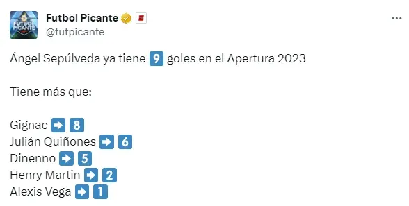 Hasta antes de la Jornada 15, Ángel Sepúlveda ya habría logrado igualar a André Pierre-Gignac como el tercer mejor goleador de toda la competencia, con ocho anotaciones. Sin embargo, con el tanto que firmó este miércoles en el Estadio Azteca, el jugador nacido en Michoacán ya pudo superar al goleador frances. Además, también se alejó de otros cracks de la Liga MX que presumen la etiqueta de goleadores y que, incluso, algunos sonaron para llegar a La Noria.
