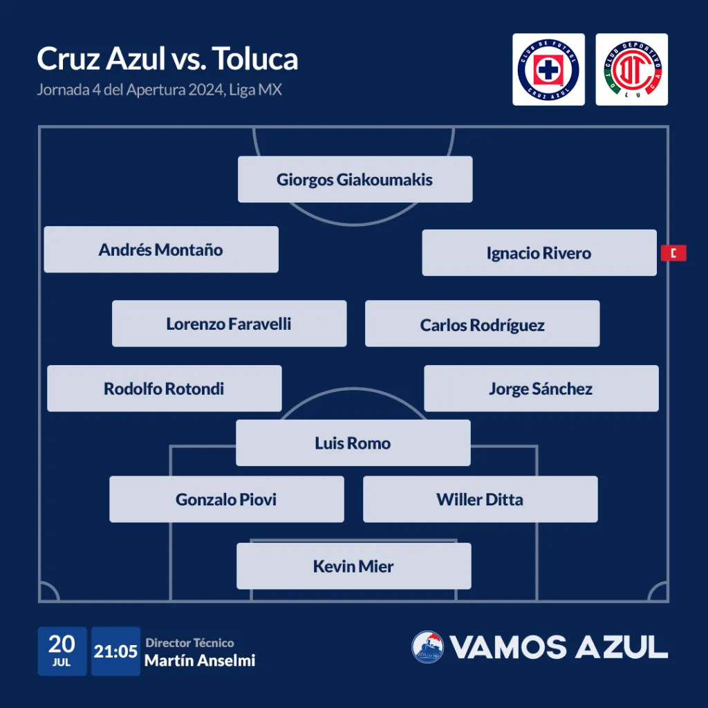 De esta manera, la alineación que mandaría Martín Anselmi con Cruz Azul ante Toluca sería la siguiente. Kevin Mier en el arco, Willer Ditta, Gonzalo Piovi y Luis Romo en la central, Jorge Sánchez y Rodolfo Rotondi como carrileros, para completar su tradicional línea de 5.