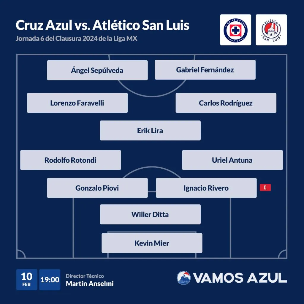 Así, el 11 de Cruz Azul para enfrentar al conjunto potosino podría ser la siguiente: Kevin Mier; Rodolfo Rotondi, Gonzalo Piovi, Willer Ditta, Ignacio Rivero, Uriel Antuna, Erik Lira, Lorenzo Faravelli, Carlos Rodríguez, Gabriel Fernández y Ángel Sepúlveda.