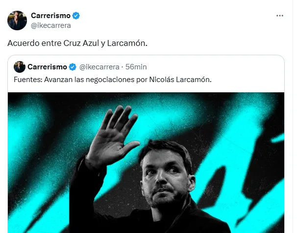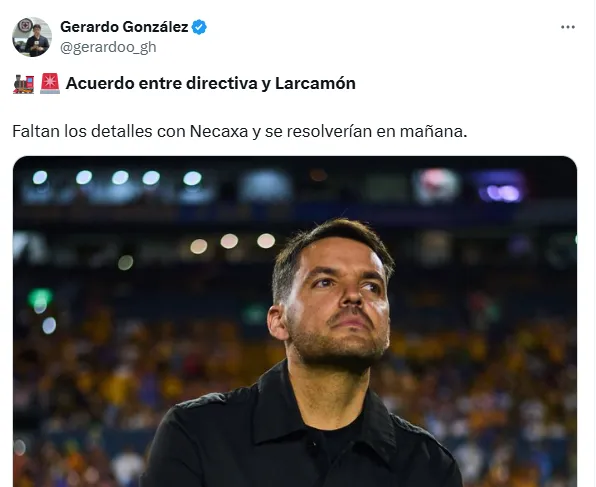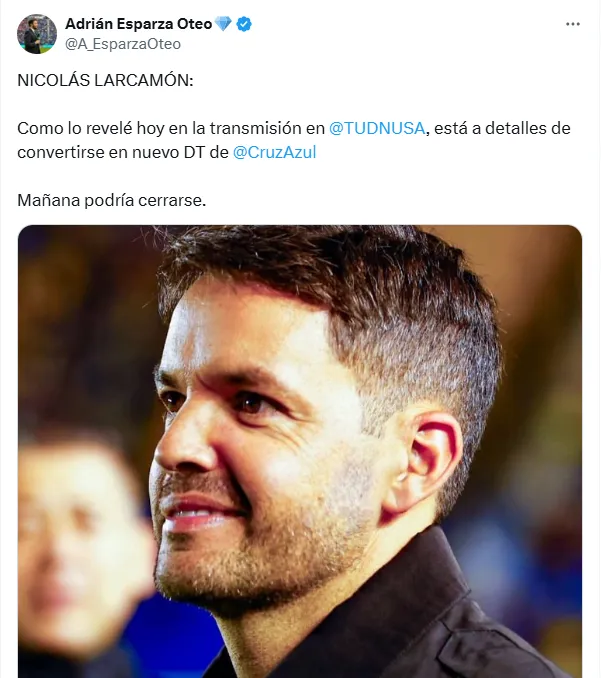 La llegada del actual técnico de Necaxa a La Noria parece inminente. Así lo dieron por hecho varias fuentes cercanas al entorno del club, como Adrián Esparza Oteo, durante la transmisión de la final para TUDN USA y después del partido en su cuenta de X: “NICOLÁS LARCAMÓN: Como lo revelé hoy en la transmisión, está a detalles de convertirse en nuevo DT de Cruz Azul. Mañana podría cerrarse“.