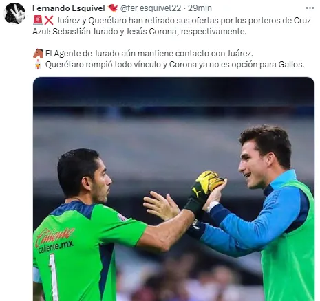 De acuerdo a información del periodista Fernando Esquivel, tanto “Juárez y Querétaro han retirado sus ofertas por los porteros de Cruz Azul, Sebastián Jurado y Jesús Corona”, respectivamente. De todas maneras, uno tendría perspectivas completamente diferentes al otro en cuanto a su permanencia en La Noria.