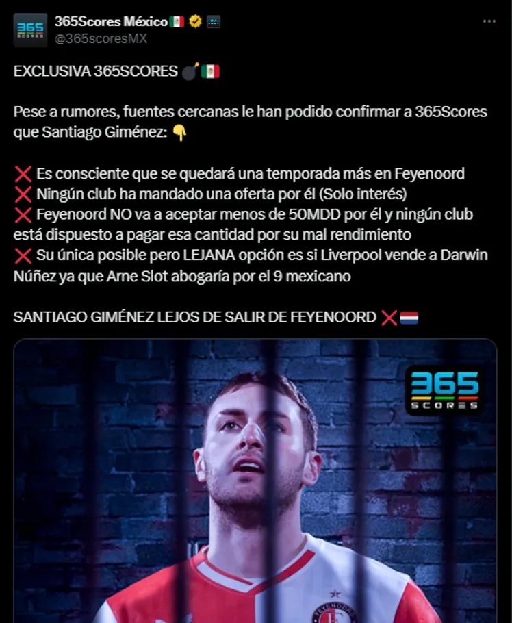 De todas maneras, vale aclarar que las cosas para Santi en esta temporada seguirían así, vistiendo la playera del cuadro rojiblanco. “Es consciente que se quedará una temporada más en Feyenoord. Ningún club ha mandado una oferta por él (Solo interés). Feyenoord NO va a aceptar menos de 50MDD por él y ningún club está dispuesto a pagar esa cantidad por su mal rendimiento”, indicaron.